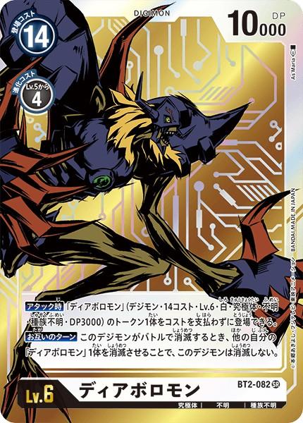 【アタック時】「ディアボロモン」(デジモン・14コスト・Lv.6・白・究極体・不明・種族不明・DP3000)のトークン1体をコストを支払わずに登場できる。【お互いのターン】このデジモンがバトルで消滅するとき、他の自分の「ディアボロモン」1体を消滅させることで、このデジモンは消滅しない。