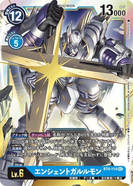 【アタック時】[ターンに1回]名称に「ガルルモン」を含むか特徴に「ハイブリッド体」を持つ自分のデジモン2体までをアクティブにする。【消滅時】自分の手札から、特徴に「ハイブリッド体」を持つ青のLv.4以下のデジモンカード1枚をコストを支払わずに登場できる。