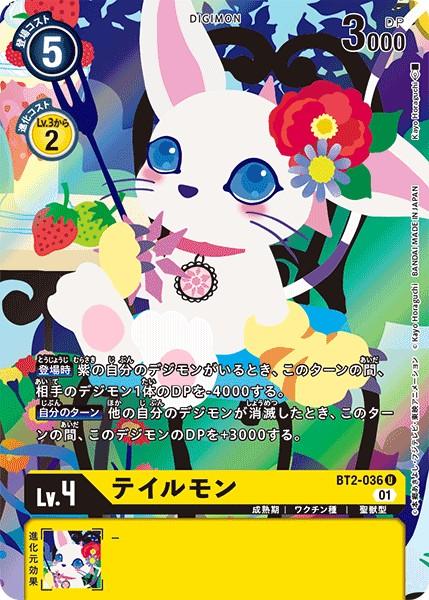 【登場時】紫の自分のデジモンがいるとき、このターンの間、相手のデジモン1体のDPを-4000する。【自分のターン】他の自分のデジモンが消滅したとき、このターンの間、このデジモンのDPを+3000する。