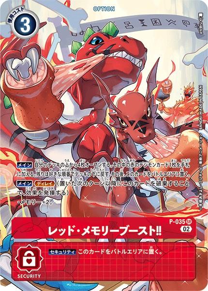 【メイン】自分のデッキの上から4枚オープンする。その中の赤のデジモンカード1枚を手札に加える。残りは好きな順番でデッキの下に戻す。その後、このカードをバトルエリアに置く。【メイン】≪ディレイ≫(置いた次のターン以降にこのカードを破棄することで、効果を発揮する)・メモリー+2。