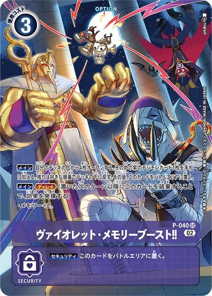 【メイン】自分のデッキの上から4枚オープンする。その中の紫のデジモンカード1枚を手札に加える。残りは好きな順番でデッキの下に戻す。その後、このカードをバトルエリアに置く。【メイン】≪ディレイ≫(置いた次のターン以降にこのカードを破棄することで、効果を発揮する)・メモリー+2。
