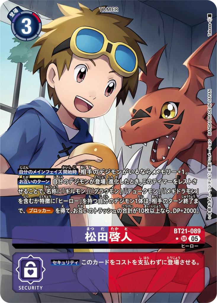 【自分のメインフェイズ開始時】相手のデジモンがいるなら、メモリー+1。【お互いのターン】自分のデジモンが登場/進化したとき、このテイマーをレストさせることで、名称に「ギルモン」/「グラウモン」/「デュークモン」/「メギドラモン」を含むか特徴に「ヒーロー」を持つ自分のデジモン1体は、相手のターン終了まで、≪ブロッカー≫を得て、お互いのトラッシュの合計が10枚以上なら、DP+2000。