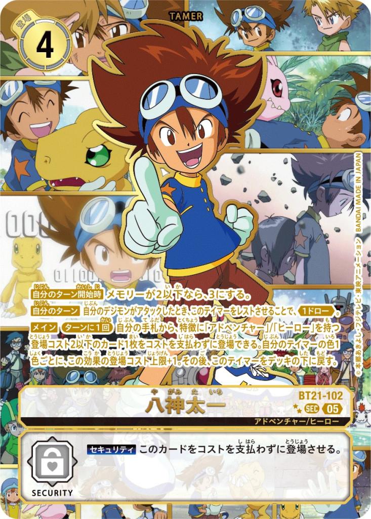 【自分のターン開始時】メモリーが2以下なら、3にする。【自分のターン】自分のデジモンがアタックしたとき、このテイマーをレストさせることで、≪1ドロー≫。【メイン】[ターンに1回]自分の手札から、特徴に「アドベンチャー」/「ヒーロー」を持つ登場コスト2以下のカード1枚をコストを支払わずに登場できる。自分のテイマーの色1色ごとに、この効果の登場コスト上限+1。その後、このテイマーをデッキの下に戻す。