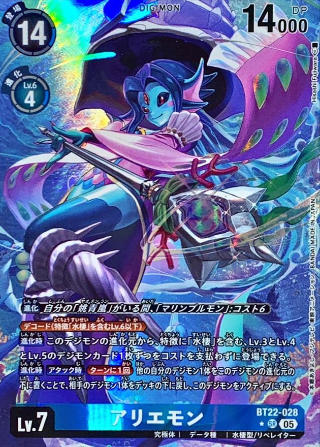 ≪デコード《特徴「水棲」を含むLv.6以下》≫【進化時】このデジモンの進化元から、特徴に「水棲」を含む、Lv.3とLv.4とLv.5のデジモンカード1枚ずつをコストを支払わずに登場できる。【進化時】【アタック時】[ターンに1回]他の自分のデジモン1体をこのデジモンの進化元の下に置くことで、相手のデジモン1体をデッキの下に戻し、このデジモンをアクティブにする。