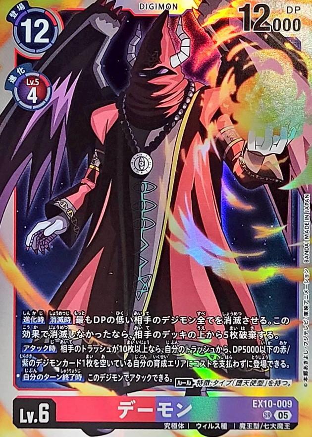 【進化時】【消滅時】最もDPの低い相手のデジモン全てを消滅させる。この効果で消滅しなかったなら、相手のデッキの上から5枚破棄する。【アタック時】相手のトラッシュが10枚以上なら、自分のトラッシュから、DP5000以下の赤/紫のデジモンカード1枚を空いている自分の育成エリアにコストを支払わずに登場できる。【自分のターン終了時】このデジモンでアタックできる。〈ルール〉特徴:タイプ「堕天使型」を持つ。
