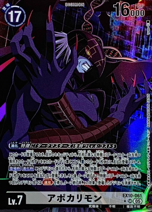 このカードが登場するとき、自分のセキュリティから、名称の異なる特徴に「ダークマスターズ」を持つ表向きのカード1枚ずつをこのカードの下に置くことで、置いたカード1枚ごとに、支払う登場コスト-4。【登場時】【進化時】このデジモンの進化元から、名称の異なる特徴に「ダークマスターズ」を持つカード1枚ずつをコストを支払わずに登場できる。その後、ターン終了まで、特徴に「ダークマスターズ」を持つ自分のデジモン全ては≪速攻≫を得る。ターン終了時、この効果で登場したデジモンを消滅させる。