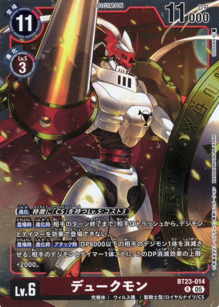 【登場時】【進化時】相手のターン終了まで、相手はトラッシュから、デジモンとテイマーを効果で登場できない。【登場時】【進化時】【アタック時】DP8000以下の相手のデジモン1体を消滅させる。相手のデジモンとテイマー1体ごとに、このDP消滅効果の上限+2000。
