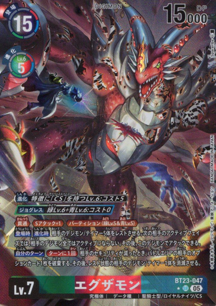 ≪貫通≫≪Sアタック+1≫≪パーティション《緑Lv.5&青Lv.5》≫【登場時】【進化時】相手のデジモン/テイマー5体をレストさせる。次の相手のアクティブフェイズでは、相手のデジモン全てはアクティブにならない。その後、このデジモンでアタックできる。【自分のターン】[ターンに1回]相手のセキュリティが減ったとき、バトルエリアの相手のオプションカード1枚を破棄する。その後、レスト状態の相手のデジモン/テイマー1体を消滅させる。