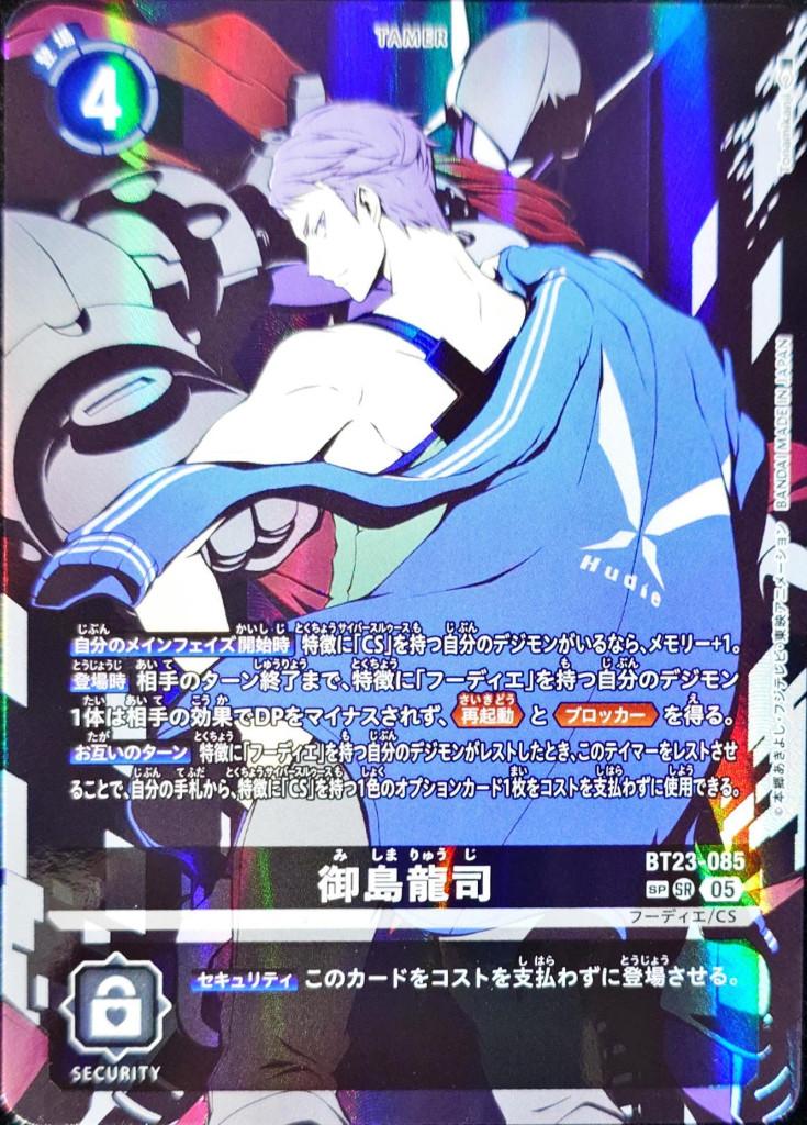 【自分のメインフェイズ開始時】特徴に「CS」を持つ自分のデジモンがいるなら、メモリー+1。【登場時】相手のターン終了まで、特徴に「フーディエ」を持つ自分のデジモン1体は相手の効果でDPをマイナスされず、≪再起動≫と≪ブロッカー≫を得る。【お互いのターン】特徴に「フーディエ」を持つ自分のデジモンがレストしたとき、このテイマーをレストさせることで、自分の手札から、特徴に「CS」を持つ1色のオプションカード1枚をコストを支払わずに使用できる。