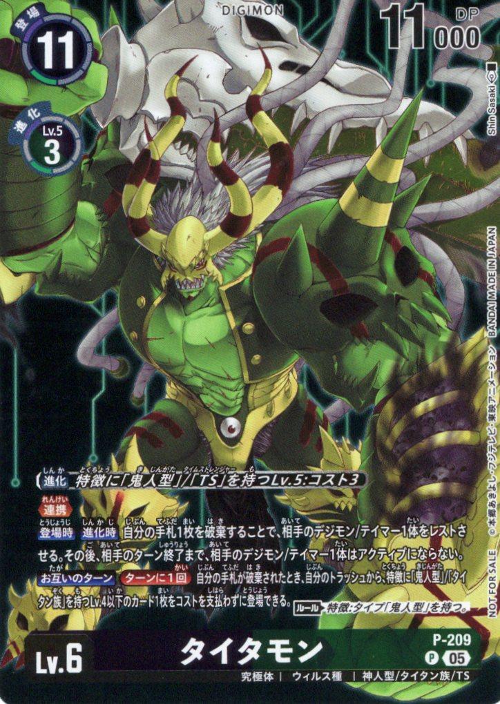 ≪連携≫【登場時】【進化時】自分の手札1枚を破棄することで、相手のデジモン/テイマー1体をレストさせる。その後、相手のターン終了まで、相手のデジモン/テイマー1体はアクティブにならない。【お互いのターン】[ターンに1回]自分の手札が破棄されたとき、自分のトラッシュから、特徴に「鬼人型」/「タイタン族」を持つLv.4以下のカード1枚をコストを支払わずに登場できる。〈ルール〉特徴:タイプ「鬼人型」を持つ。