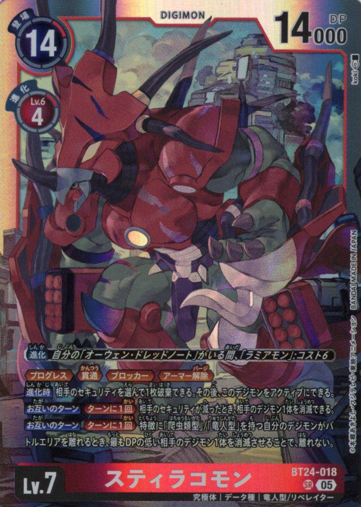 ≪プログレス≫≪貫通≫≪ブロッカー≫≪アーマー解除≫【進化時】相手のセキュリティを選んで1枚破棄できる。その後、このデジモンをアクティブにできる。【お互いのターン】[ターンに1回]相手のセキュリティが減ったとき、相手のデジモン1体を消滅できる。【お互いのターン】[ターンに1回]特徴に「爬虫類型」/「竜人型」を持つ自分のデジモンがバトルエリアを離れるとき、最もDPの低い相手のデジモン1体を消滅させることで、離れない。