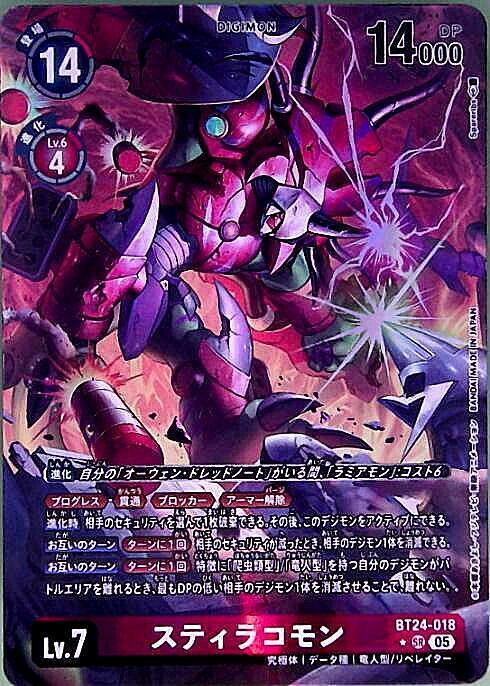 ≪プログレス≫≪貫通≫≪ブロッカー≫≪アーマー解除≫【進化時】相手のセキュリティを選んで1枚破棄できる。その後、このデジモンをアクティブにできる。【お互いのターン】[ターンに1回]相手のセキュリティが減ったとき、相手のデジモン1体を消滅できる。【お互いのターン】[ターンに1回]特徴に「爬虫類型」/「竜人型」を持つ自分のデジモンがバトルエリアを離れるとき、最もDPの低い相手のデジモン1体を消滅させることで、離れない。