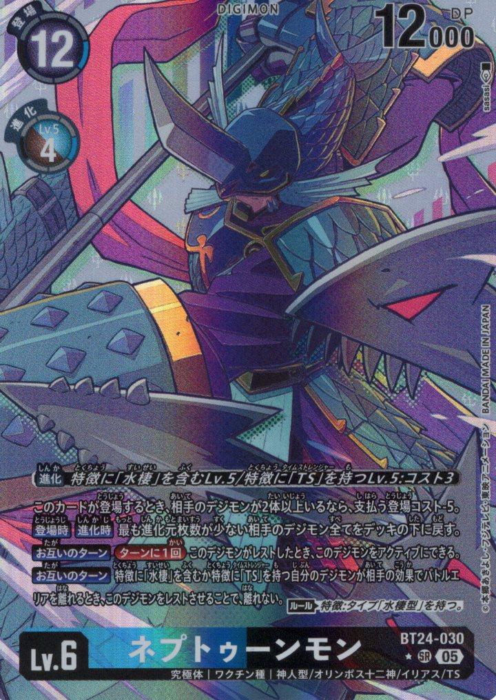 このカードが登場するとき、相手のデジモンが2体以上いるなら、支払う登場コスト-5。【登場時】【進化時】最も進化元枚数が少ない相手のデジモン全てをデッキの下に戻す。【お互いのターン】[ターンに1回]このデジモンがレストしたとき、このデジモンをアクティブにできる。【お互いのターン】特徴に「水棲」を含むか特徴に「TS」を持つ自分のデジモンが相手の効果でバトルエリアを離れるとき、このデジモンをレストさせることで、離れない。〈ルール〉特徴:タイプ「水棲型」を持つ。