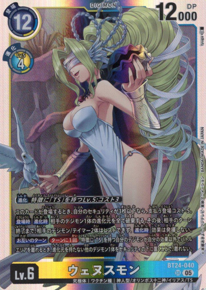 このカードが登場するとき、自分のセキュリティが3枚以下なら、支払う登場コスト-5。【登場時】【進化時】相手のデジモン1体の進化元を全て破棄する。その後、相手のターン終了まで、相手のデジモン/テイマー2体はレストできず、【進化時】効果は発揮しない。【お互いのターン】[ターンに1回]特徴に「TS」を持つ自分のデジモンが自分の効果以外でバトルエリアを離れるとき、進化元を持たない他のデジモン1体をセキュリティの下に置くことで、離れない。