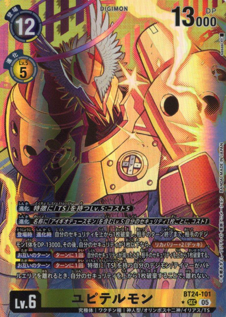 【登場時】【進化時】自分のセキュリティを上から1枚破棄し、相手のターン終了まで、相手のデジモン1体をDP-13000。その後、自分のセキュリティが1枚以下なら、≪リカバリー+2《デッキ》≫。【お互いのターン】[ターンに1回]自分のセキュリティが減ったとき、相手のセキュリティを上から1枚破棄する。【お互いのターン】[ターンに1回]特徴に「TS」を持つ自分のデジモン/テイマーがバトルエリアを離れるとき、自分のセキュリティを上から1枚破棄することで、離れない。