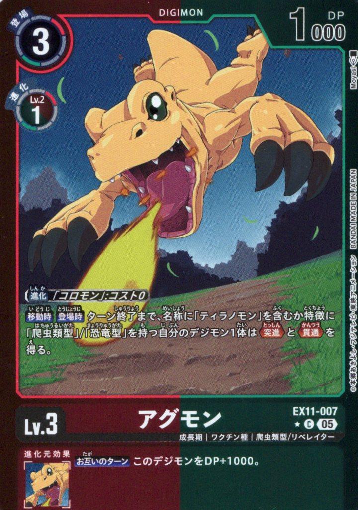 【移動時】【登場時】ターン終了まで、名称に「ティラノモン」を含むか特徴に「爬虫類型」/「恐竜型」を持つ自分のデジモン1体は≪突進≫と≪貫通≫を得る。