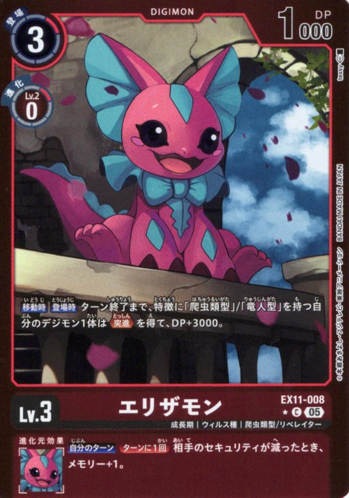 【移動時】【登場時】ターン終了まで、特徴に「爬虫類型」/「竜人型」を持つ自分のデジモン1体は≪突進≫を得て、DP+3000。
