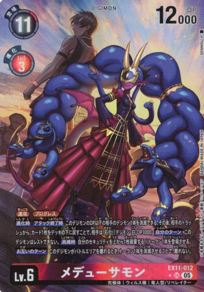 ≪速攻≫≪プログレス≫【進化時】【アタック終了時】このデジモンのDP以下の相手のデジモン1体を消滅できる。その後、相手のトラッシュから、カード1枚をデッキの下に戻すことで、相手は「石化」(デジモン・白・DP3000・【自分のターン】このデジモンはレストできない。【消滅時】自分のセキュリティを上から1枚破棄する。)トークン1体を登場させる。【お互いのターン】このデジモンがバトルエリアを離れるとき、トークン1体を消滅させることで、離れない。