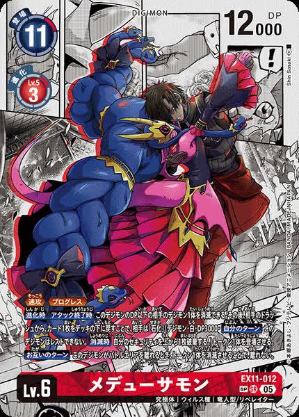 ≪速攻≫≪プログレス≫【進化時】【アタック終了時】このデジモンのDP以下の相手のデジモン1体を消滅できる。その後、相手のトラッシュから、カード1枚をデッキの下に戻すことで、相手は「石化」(デジモン・白・DP3000・【自分のターン】このデジモンはレストできない。【消滅時】自分のセキュリティを上から1枚破棄する。)トークン1体を登場させる。【お互いのターン】このデジモンがバトルエリアを離れるとき、トークン1体を消滅させることで、離れない。