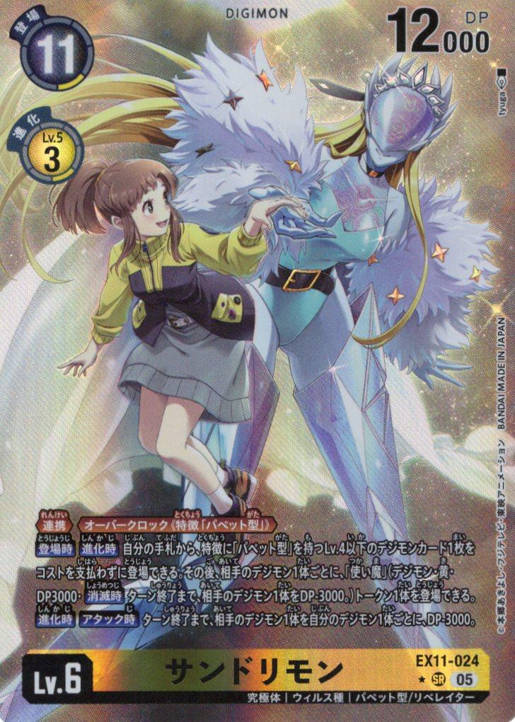 ≪連携≫≪オーバークロック《特徴「パペット型」》≫【登場時】【進化時】自分の手札から、特徴に「パペット型」を持つLv.4以下のデジモンカード1枚をコストを支払わずに登場できる。その後、相手のデジモン1体ごとに、「使い魔」(デジモン・黄・DP3000・【消滅時】ターン終了まで、相手のデジモン1体をDP-3000。)トークン1体を登場できる。【進化時】【アタック時】ターン終了まで、相手のデジモン1体を自分のデジモン1体ごとに、DP-3000。