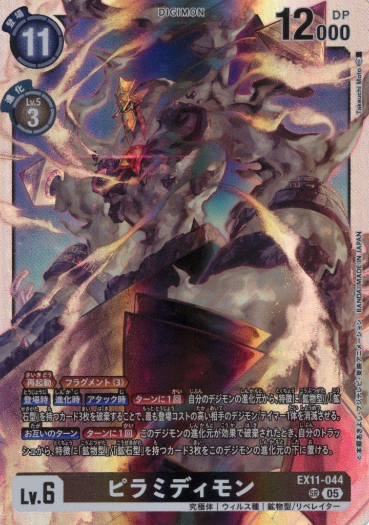 ≪再起動≫≪フラグメント《3》≫【登場時】【進化時】【アタック時】[ターンに1回]自分のデジモンの進化元から、特徴に「鉱物型」/「鉱石型」を持つカード3枚を破棄することで、最も登場コストの高い相手のデジモン/テイマー1体を消滅させる。【お互いのターン】[ターンに1回]このデジモンの進化元が効果で破棄されたとき、自分のトラッシュから、特徴に「鉱物型」/「鉱石型」を持つカード3枚をこのデジモンの進化元の下に置ける。