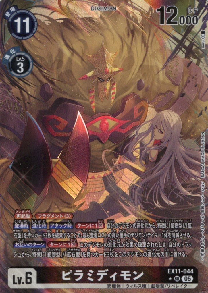 ≪再起動≫≪フラグメント《3》≫【登場時】【進化時】【アタック時】[ターンに1回]自分のデジモンの進化元から、特徴に「鉱物型」/「鉱石型」を持つカード3枚を破棄することで、最も登場コストの高い相手のデジモン/テイマー1体を消滅させる。【お互いのターン】[ターンに1回]このデジモンの進化元が効果で破棄されたとき、自分のトラッシュから、特徴に「鉱物型」/「鉱石型」を持つカード3枚をこのデジモンの進化元の下に置ける。