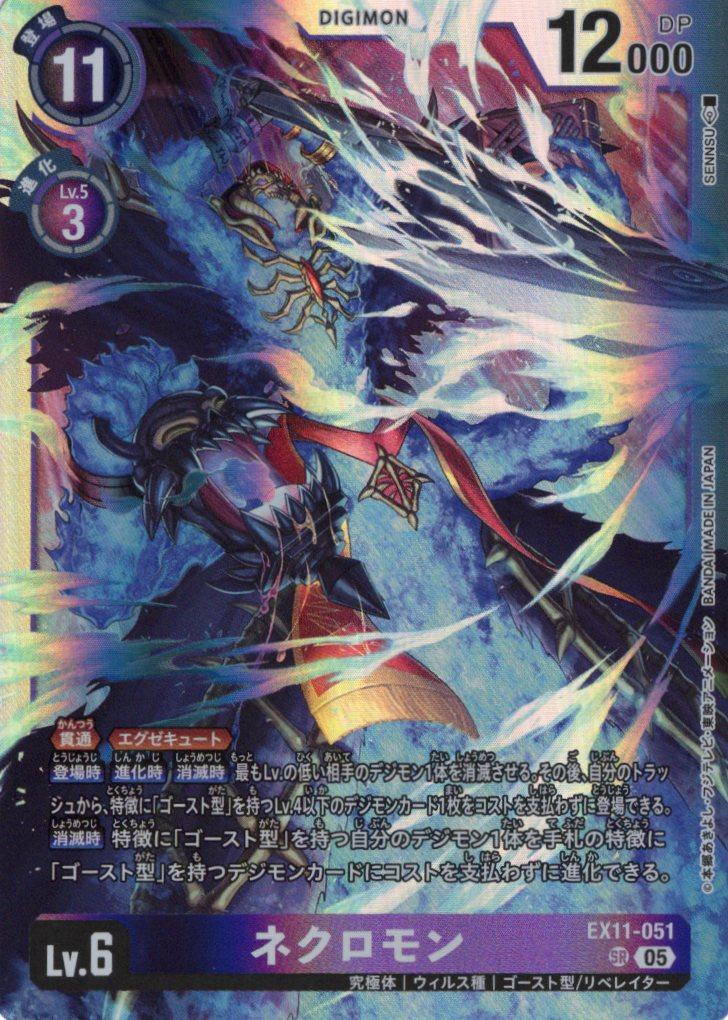 ≪貫通≫≪エグゼキュート≫【登場時】【進化時】【消滅時】最もLv.の低い相手のデジモン1体を消滅させる。その後、自分のトラッシュから、特徴に「ゴースト型」を持つLv.4以下のデジモンカード1枚をコストを支払わずに登場できる。【消滅時】特徴に「ゴースト型」を持つ自分のデジモン1体を手札の特徴に「ゴースト型」を持つデジモンカードにコストを支払わずに進化できる。