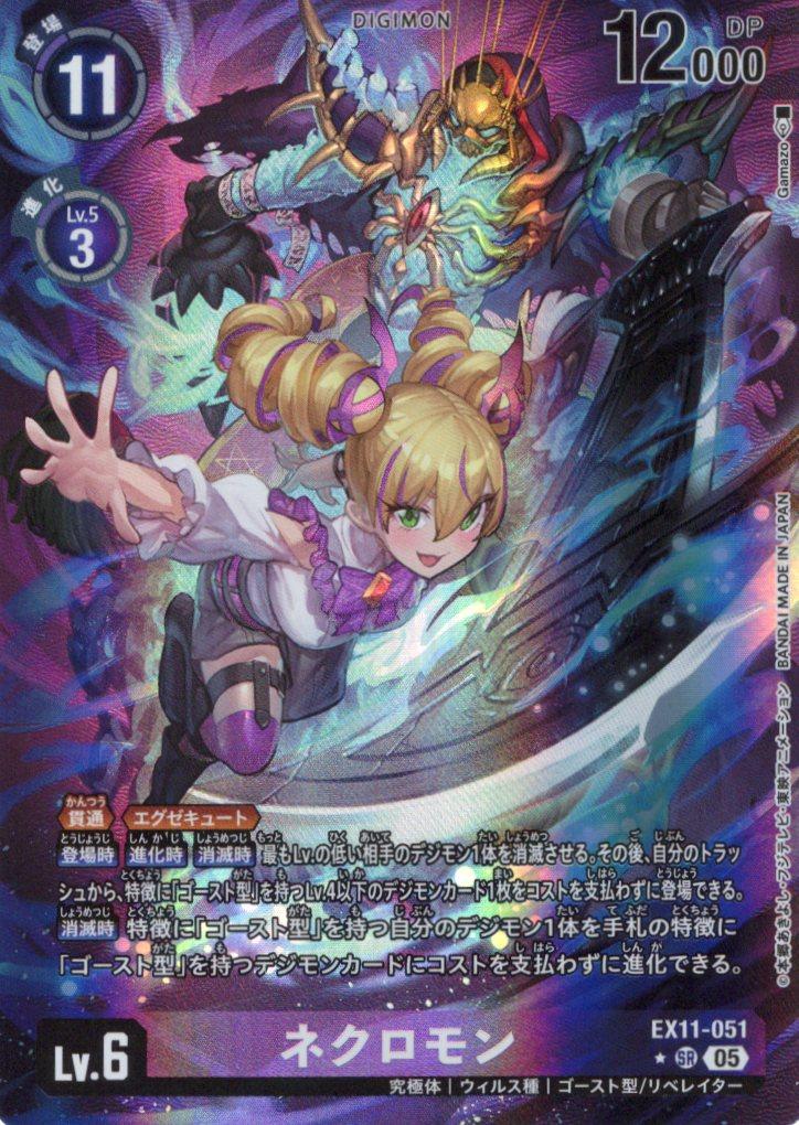 ≪貫通≫≪エグゼキュート≫【登場時】【進化時】【消滅時】最もLv.の低い相手のデジモン1体を消滅させる。その後、自分のトラッシュから、特徴に「ゴースト型」を持つLv.4以下のデジモンカード1枚をコストを支払わずに登場できる。【消滅時】特徴に「ゴースト型」を持つ自分のデジモン1体を手札の特徴に「ゴースト型」を持つデジモンカードにコストを支払わずに進化できる。