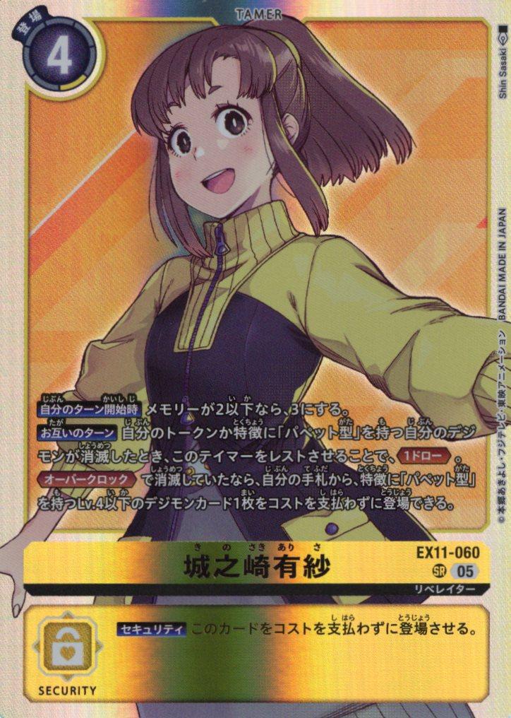 【自分のターン開始時】メモリーが2以下なら、3にする。【お互いのターン】自分のトークンか特徴に「パペット型」を持つ自分のデジモンが消滅したとき、このテイマーをレストさせることで、≪1ドロー≫。≪オーバークロック≫で消滅していたなら、自分の手札から、特徴に「パペット型」を持つLv.4以下のデジモンカード1枚をコストを支払わずに登場できる。