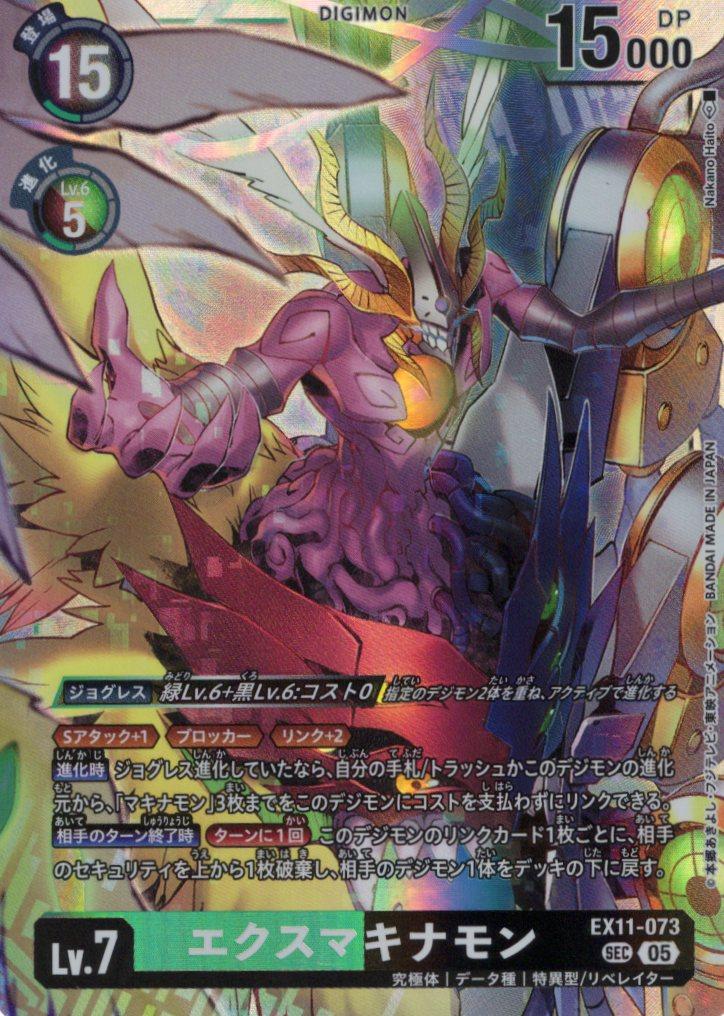 ≪Sアタック+1≫≪ブロッカー≫≪リンク+2≫【進化時】ジョグレス進化していたなら、自分の手札/トラッシュかこのデジモンの進化元から、「マキナモン」3枚までをこのデジモンにコストを支払わずにリンクできる。【相手のターン終了時】[ターンに1回]このデジモンのリンクカード1枚ごとに、相手のセキュリティを上から1枚破棄し、相手のデジモン1体をデッキの下に戻す。