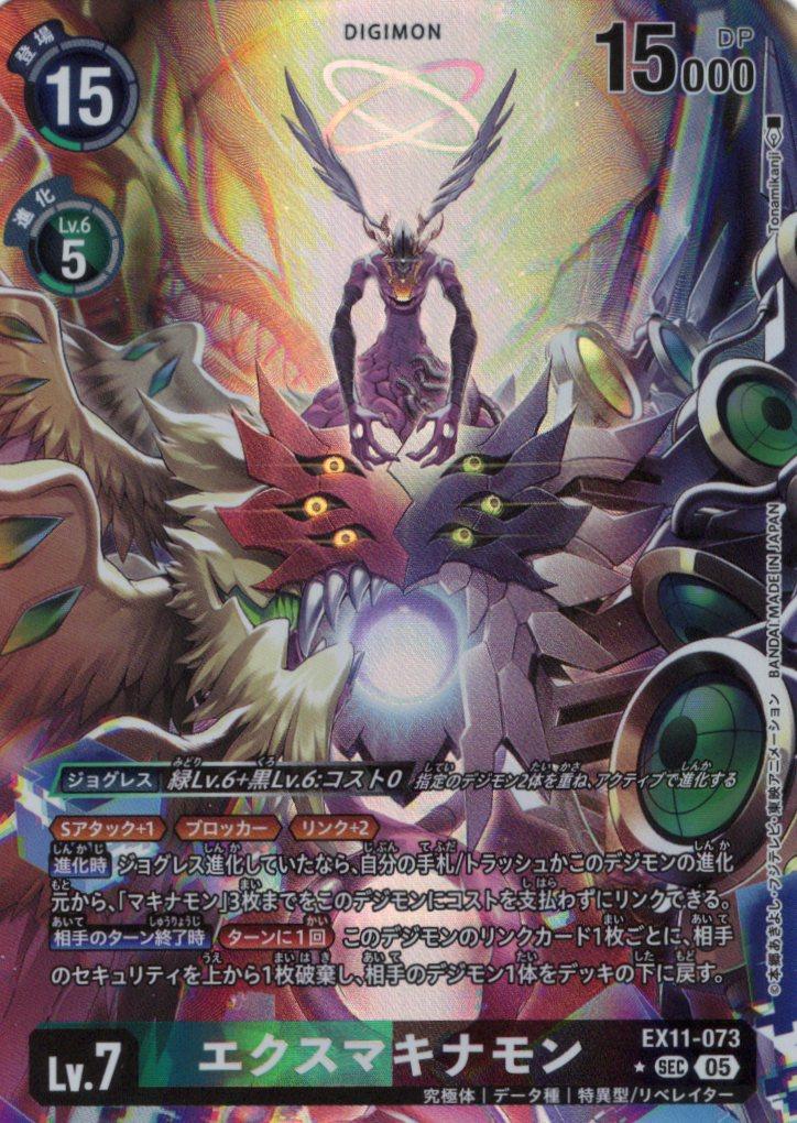 ≪Sアタック+1≫≪ブロッカー≫≪リンク+2≫【進化時】ジョグレス進化していたなら、自分の手札/トラッシュかこのデジモンの進化元から、「マキナモン」3枚までをこのデジモンにコストを支払わずにリンクできる。【相手のターン終了時】[ターンに1回]このデジモンのリンクカード1枚ごとに、相手のセキュリティを上から1枚破棄し、相手のデジモン1体をデッキの下に戻す。