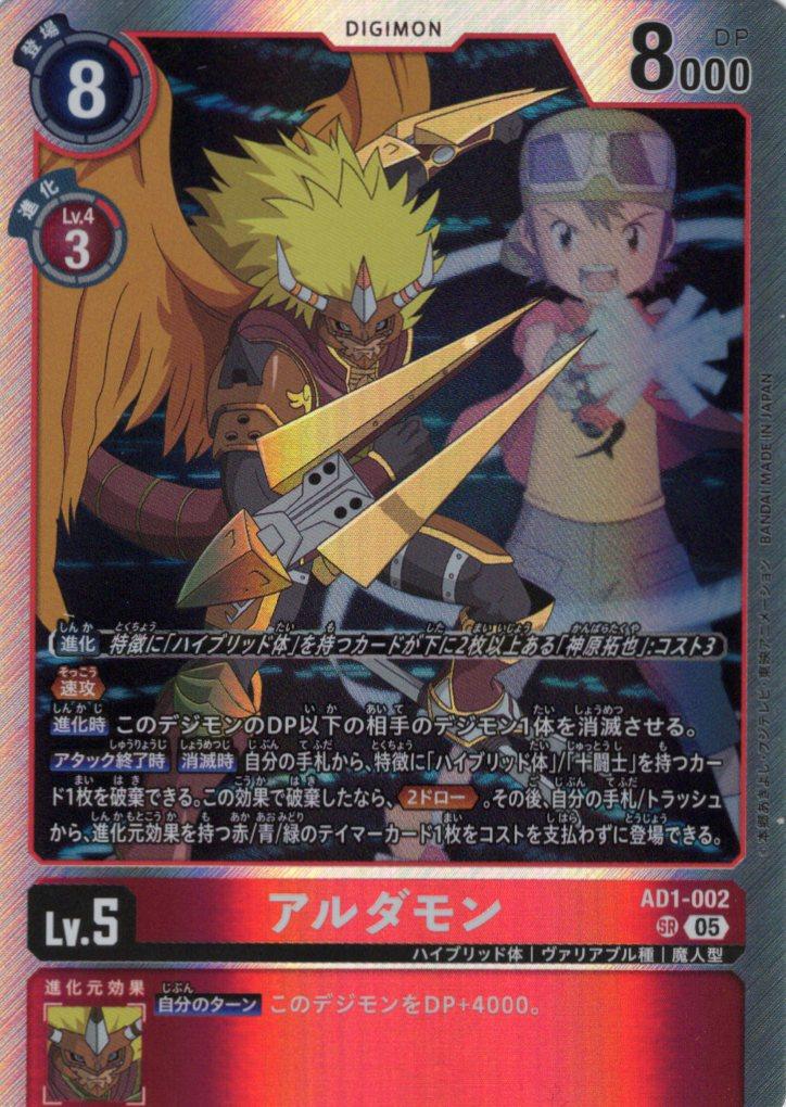 ≪速攻≫【進化時】このデジモンのDP以下の相手のデジモン1体を消滅させる。【アタック終了時】【消滅時】自分の手札から、特徴に「ハイブリッド体」/「十闘士」を持つカード1枚を破棄できる。この効果で破棄したなら、≪2ドロー≫。その後、自分の手札/トラッシュから、進化元効果を持つ赤/青/緑のテイマーカード1枚をコストを支払わずに登場できる。