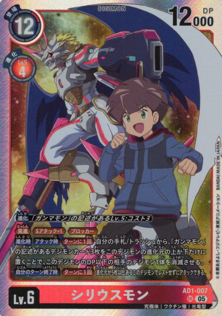 ≪突進≫≪Sアタック+1≫≪ブロッカー≫【進化時】【アタック時】[ターンに1回]自分の手札/トラッシュから、「ガンマモン」の記述があるデジモンカード3枚をこのデジモンの進化元の上か下だけに置くことで、このデジモンのDP以下の相手のデジモン1体を消滅させる。【自分のターン終了時】[ターンに1回]進化元が5枚以上あるこのデジモンでレストせずにアタックできる。