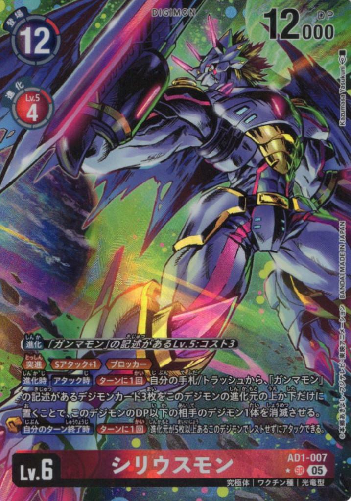 ≪突進≫≪Sアタック+1≫≪ブロッカー≫【進化時】【アタック時】[ターンに1回]自分の手札/トラッシュから、「ガンマモン」の記述があるデジモンカード3枚をこのデジモンの進化元の上か下だけに置くことで、このデジモンのDP以下の相手のデジモン1体を消滅させる。【自分のターン終了時】[ターンに1回]進化元が5枚以上あるこのデジモンでレストせずにアタックできる。