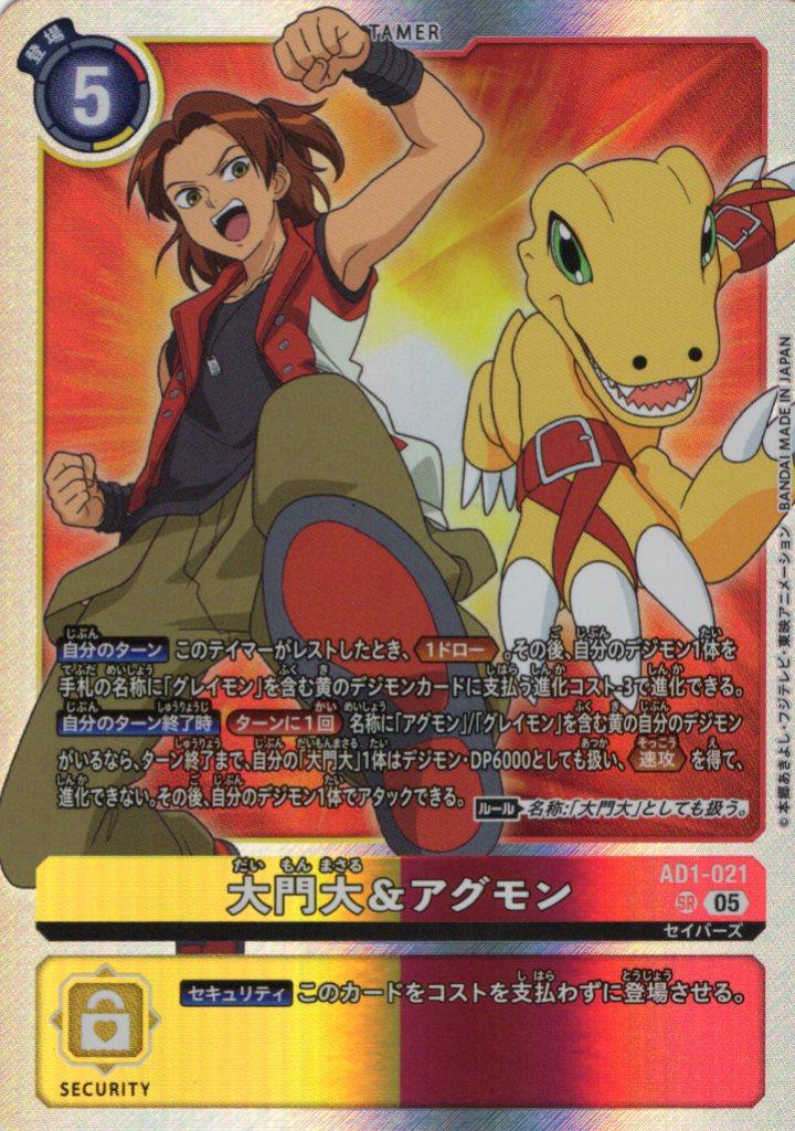 【自分のターン】このテイマーがレストしたとき、≪1ドロー≫。その後、自分のデジモン1体を手札の名称に「グレイモン」を含む黄のデジモンカードに支払う進化コスト-3で進化できる。【自分のターン終了時】[ターンに1回]名称に「アグモン」/「グレイモン」を含む黄の自分のデジモンがいるなら、ターン終了まで、自分の「大門大」1体はデジモン・DP6000としても扱い、≪速攻≫を得て、進化できない。その後、自分のデジモン1体でアタックできる。〈ルール〉名称:「大門大」としても扱う。
