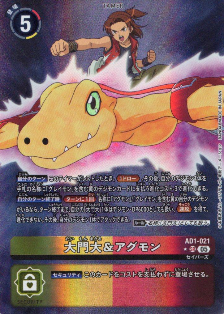 【自分のターン】このテイマーがレストしたとき、≪1ドロー≫。その後、自分のデジモン1体を手札の名称に「グレイモン」を含む黄のデジモンカードに支払う進化コスト-3で進化できる。【自分のターン終了時】[ターンに1回]名称に「アグモン」/「グレイモン」を含む黄の自分のデジモンがいるなら、ターン終了まで、自分の「大門大」1体はデジモン・DP6000としても扱い、≪速攻≫を得て、進化できない。その後、自分のデジモン1体でアタックできる。〈ルール〉名称:「大門大」としても扱う。
