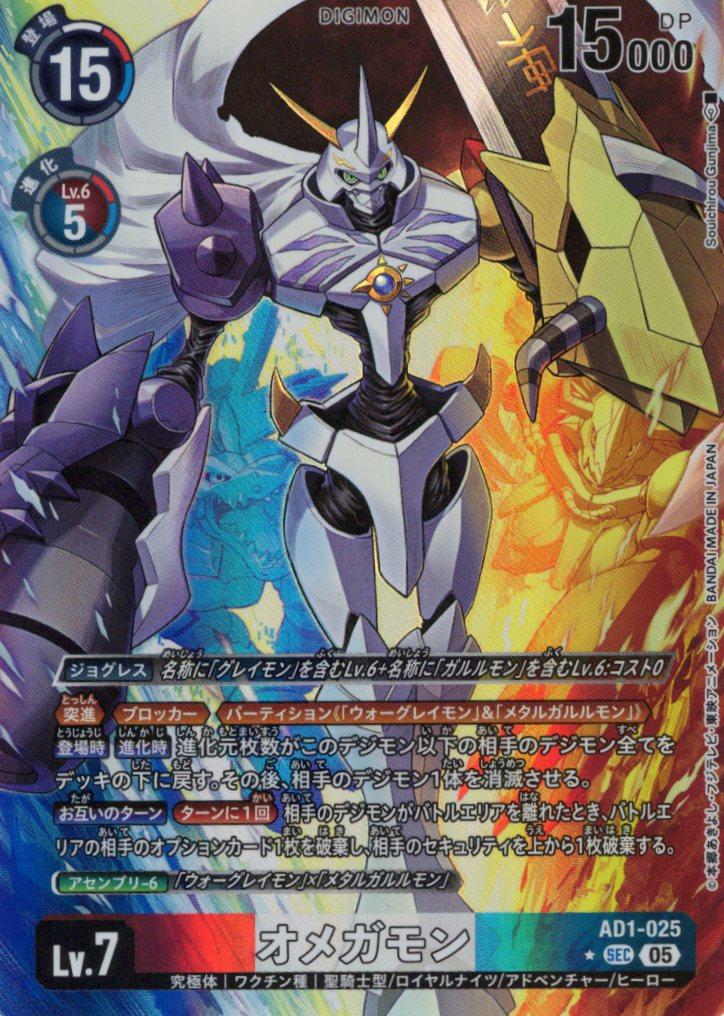 ≪突進≫≪ブロッカー≫≪パーティション《「ウォーグレイモン」&「メタルガルルモン」》≫【登場時】【進化時】進化元枚数がこのデジモン以下の相手のデジモン全てをデッキの下に戻す。その後、相手のデジモン1体を消滅させる。【お互いのターン】[ターンに1回]相手のデジモンがバトルエリアを離れたとき、バトルエリアの相手のオプションカード1枚を破棄し、相手のセキュリティを上から1枚破棄する。