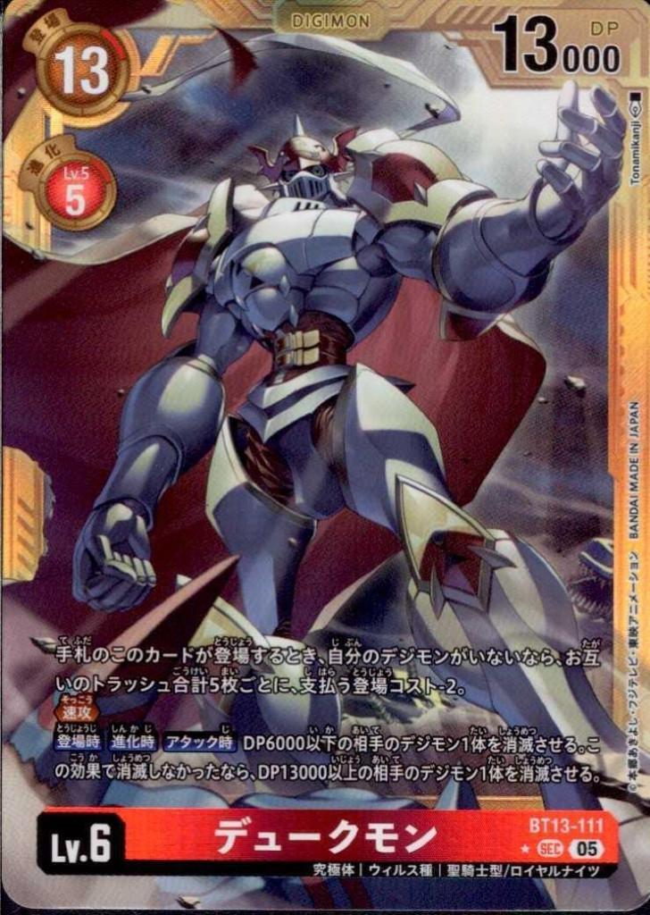 手札のこのカードが登場するとき、自分のデジモンがいないなら、お互いのトラッシュ合計5枚ごとに、支払う登場コスト-2。≪速攻≫【登場時】【進化時】【アタック時】DP6000以下の相手のデジモン1体を消滅させる。この効果で消滅しなかったなら、DP13000以上の相手のデジモン1体を消滅させる。