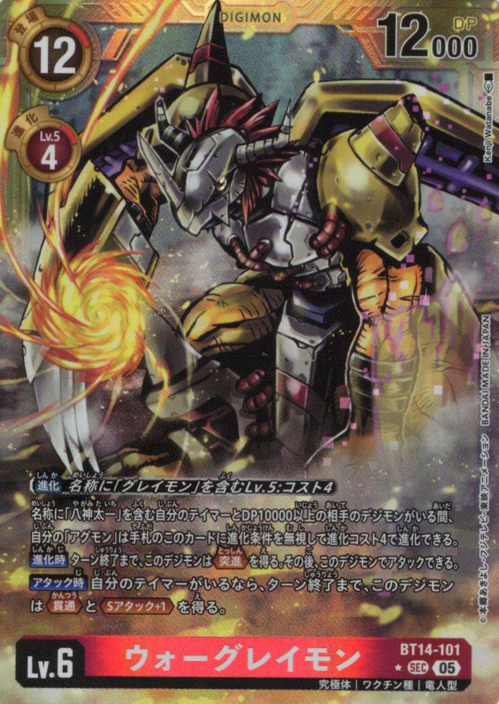 名称に「八神太一」を含む自分のテイマーとDP10000以上の相手のデジモンがいる間、自分の「アグモン」は手札のこのカードに進化条件を無視して進化コスト4で進化できる。【進化時】ターン終了まで、このデジモンは≪突進≫を得る。その後、このデジモンでアタックできる。【アタック時】自分のテイマーがいるなら、ターン終了まで、このデジモンは≪貫通≫と≪Sアタック+1≫を得る。