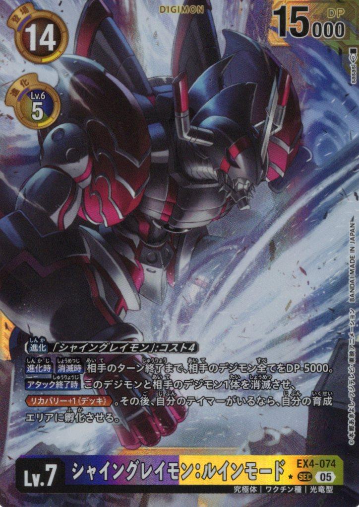 【進化時】【消滅時】相手のターン終了まで、相手のデジモン全てをDP-5000。【アタック終了時】このデジモンと相手のデジモン1体を消滅させ、≪リカバリー+1《デッキ》≫。その後、自分のテイマーがいるなら、自分の育成エリアに孵化させる。