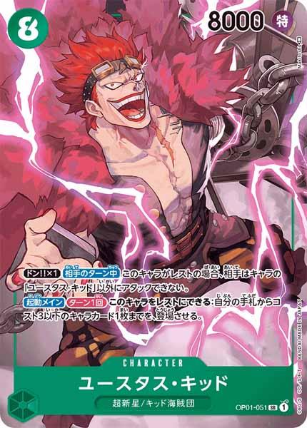 テキスト:【ドン‼×1】【相手のターン中】このキャラがレストの場合、相手はキャラの「ユースタス・キッド」以外にアタックできない。【起動メイン】【ターン1回】このキャラをレストにできる:自分の手札からコスト3以下のキャラカード1枚までを、登場させる。