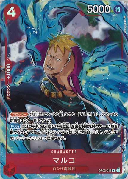 テキスト:【ブロッカー】(相手のアタックの後、このカードをレストにし、アタックの対象をこのカードにできる)【KO時】自分の手札から『白ひげ海賊団』を含む特徴を持つカード1枚を捨てることができる:自分のライフが2枚以下の場合、このキャラカードをトラッシュからレストで登場させる。