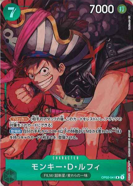 テキスト:【ブロッカー】(相手のアタックの後、このカードをレストにし、アタックの対象をこのカードにできる)【登場時】自分の手札からコスト4以下の特徴《FILM》か《麦わらの一味》を持つキャラカード1枚までを、登場させる。