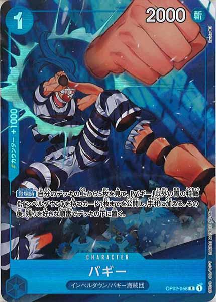 テキスト:【登場時】自分のデッキの上から5枚を見て、「バギー」以外の青の特徴《インペルダウン》を持つカード1枚までを公開し、手札に加える。その後、残りを好きな順番でデッキの下に置く。