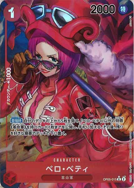テキスト:【登場時】自分のデッキの上から5枚を見て、「ベロ・ベティ」以外の特徴《革命軍》を持つカード1枚までを公開し、手札に加える。その後、残りを好きな順番でデッキの下に置く。