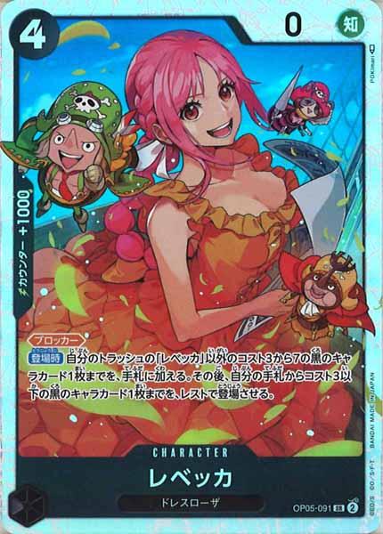テキスト:【ブロッカー】(相手のアタックの後、このカードをレストにし、アタックの対象をこのカードにできる)【登場時】自分のトラッシュの「レベッカ」以外のコスト3から7の黒のキャラカード1枚までを、手札に加える。その後、自分の手札からコスト3以下の黒のキャラカード1枚までを、レストで登場させる。