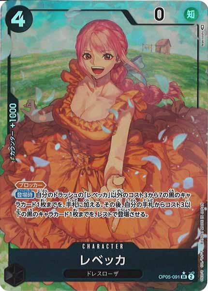テキスト:【ブロッカー】(相手のアタックの後、このカードをレストにし、アタックの対象をこのカードにできる)【登場時】自分のトラッシュの「レベッカ」以外のコスト3から7の黒のキャラカード1枚までを、手札に加える。その後、自分の手札からコスト3以下の黒のキャラカード1枚までを、レストで登場させる。