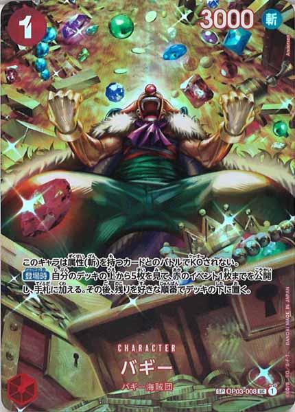 テキスト:このキャラは属性(斬)を持つカードとのバトルでKOされない。【登場時】自分のデッキの上から5枚を見て、赤のイベント1枚までを公開し、手札に加える。その後、残りを好きな順番でデッキの下に置く。