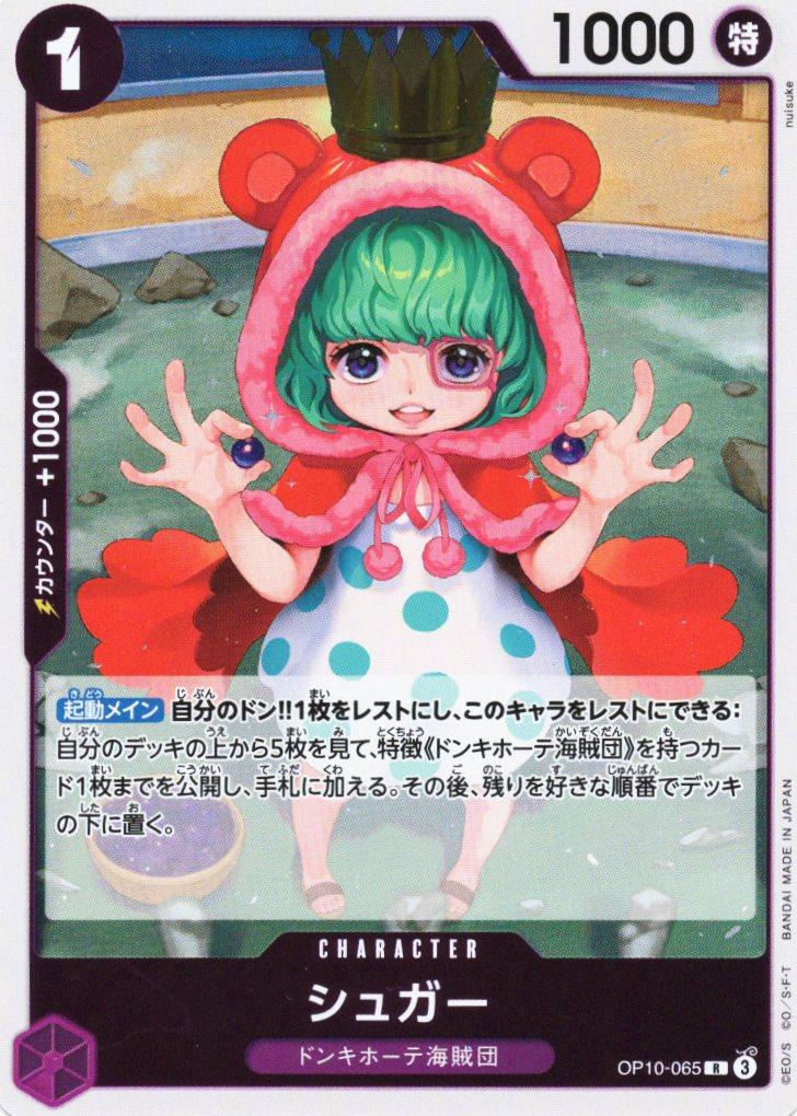 テキスト:【起動メイン】自分のドン‼1枚をレストにし、このキャラをレストにできる:自分のデッキの上から5枚を見て、特徴《ドンキホーテ海賊団》を持つカード1枚までを公開し、手札に加える。その後、残りを好きな順番でデッキの下に置く。