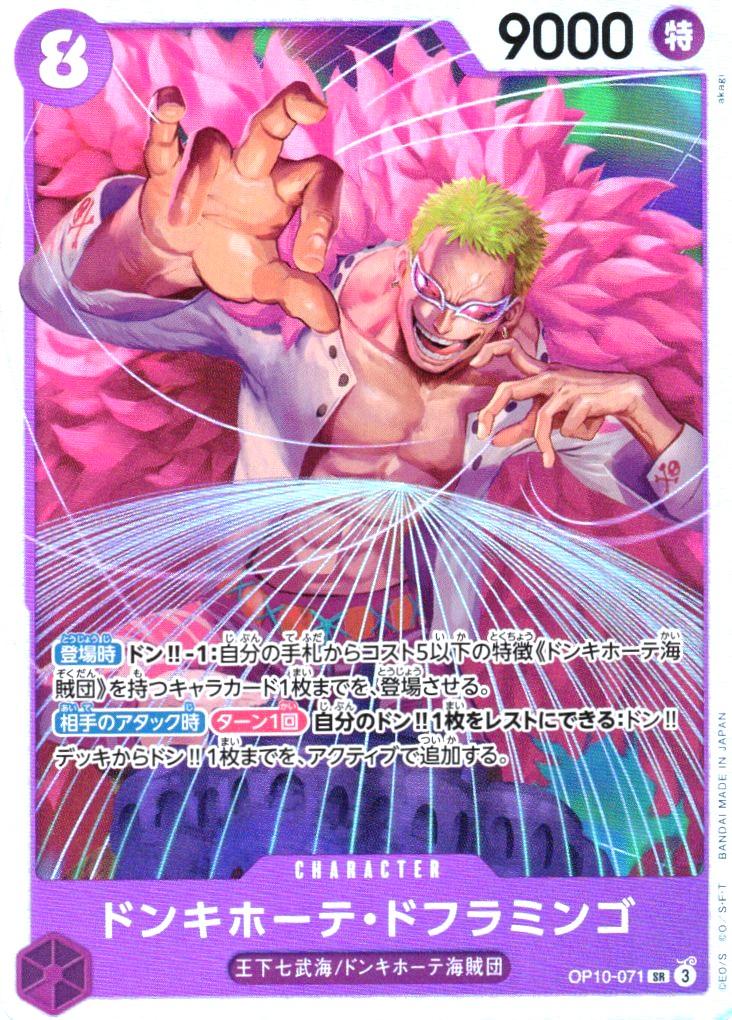 テキスト:【登場時】ドン‼-1:自分の手札からコスト5以下の特徴《ドンキホーテ海賊団》を持つキャラカード1枚までを、登場させる。【相手のアタック時】【ターン1回】自分のドン‼1枚をレストにできる:ドン‼デッキからドン‼1枚までを、アクティブで追加する。